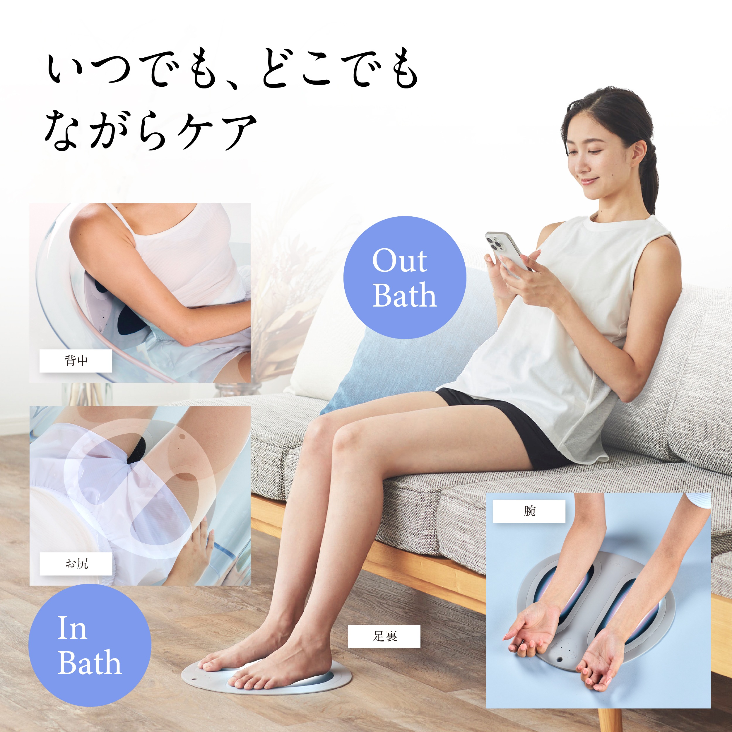 入浴中には背中や腰にフィットさせれば、日常の疲れをじんわりとほぐすような刺激が感じられ、お風呂あがりに足を乗せれば、立ち仕事や長時間の歩行でたまった疲れをそっと癒してくれます。