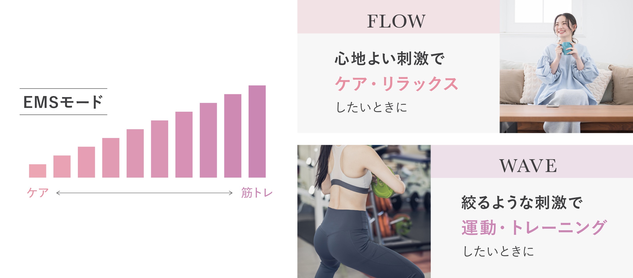 絞るような強さで深く伝わる「WAVEモード」はトレーニング時におすすめで、肩の力を抜いて、おだやかに低周波のリズムを感じたい方には、「FLOWモード」が最適。